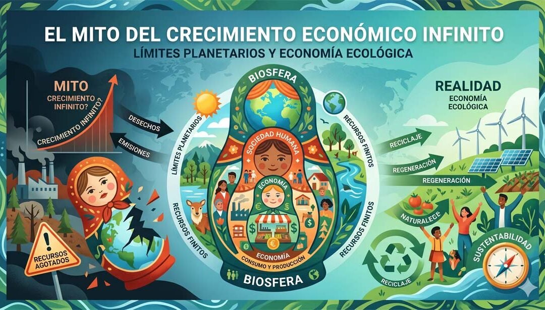Ante el fracaso de los parches financieros, surge la economía ecológica, que propone un cambio radical de arquitectura mental. En lugar de ver el mercado y el medio ambiente como entidades separadas, utiliza la analogía de las matrioskas o muñecas rusas: la economía es una muñeca pequeña que vive dentro de una más grande llamada sociedad, y ambas residen obligatoriamente dentro de la muñeca gigante que es la biósfera. Si la muñeca grande se rompe, las pequeñas desaparecen. Este modelo se basa en las leyes inquebrantables de la física y la termodinámica, recordándonos que siempre hay un desgaste y un residuo que la Tierra debe absorber; por tanto, el mito de una economía 100% circular es, en términos físicos, imposible.
